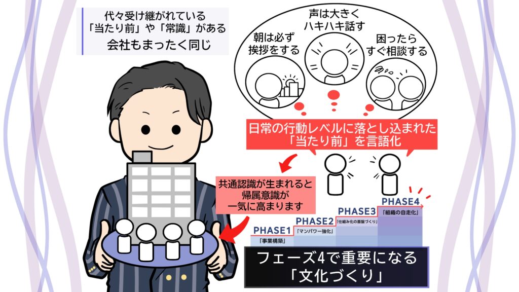 フェーズ4では、新しい挑戦をどんどん仕掛けていくことになります。仕組み化が進み、「だいぶ回るようになってきたな」という次の段階で、ぜひ意識してほしいのが文化づくりです。