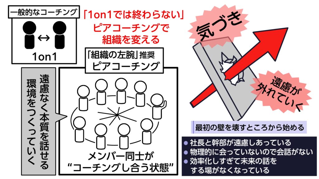 一般的なコーチングは1on1が中心ですが、「組織の左腕」が推奨しているのはピアコーチング。
