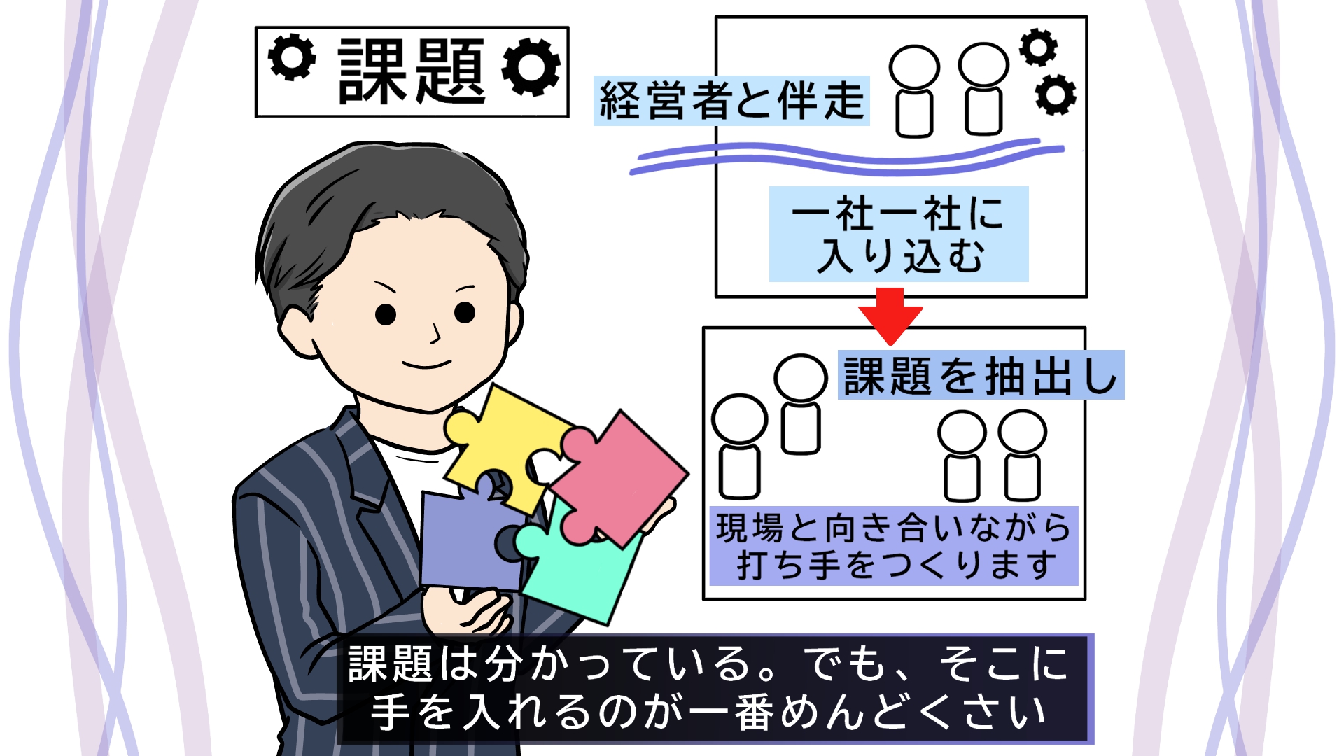 一社一社に入り込み、課題を抽出し、現場と向き合いながら打ち手をつくります。